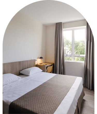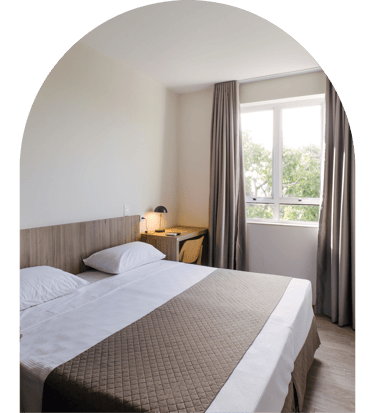 Acomodações elegantes, silenciosas e bem equipadas, perfeitas para descanso e produtividade.
