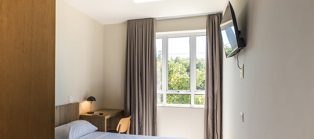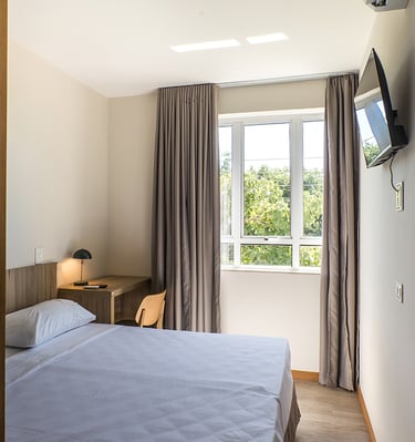 O Executivo Casal oferece um ambiente funcional, ideal para viagens a trabalho ou estadias rápidas, garantindo conforto sem excessos. Sua disposição otimizada proporciona um descanso tranquilo e uma experiência acolhedora para casais ou viajantes individuais.