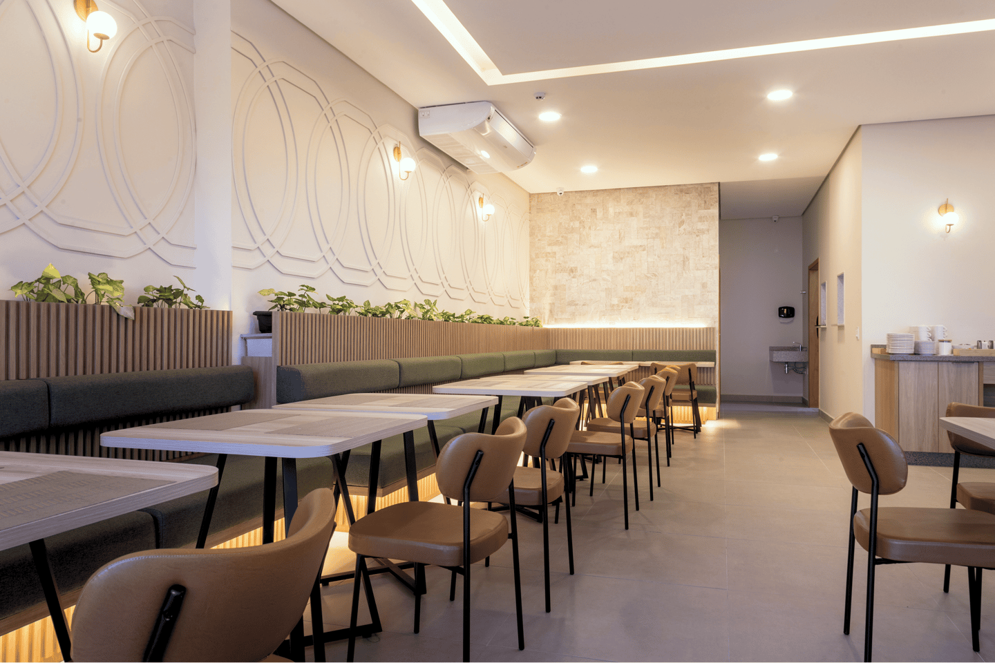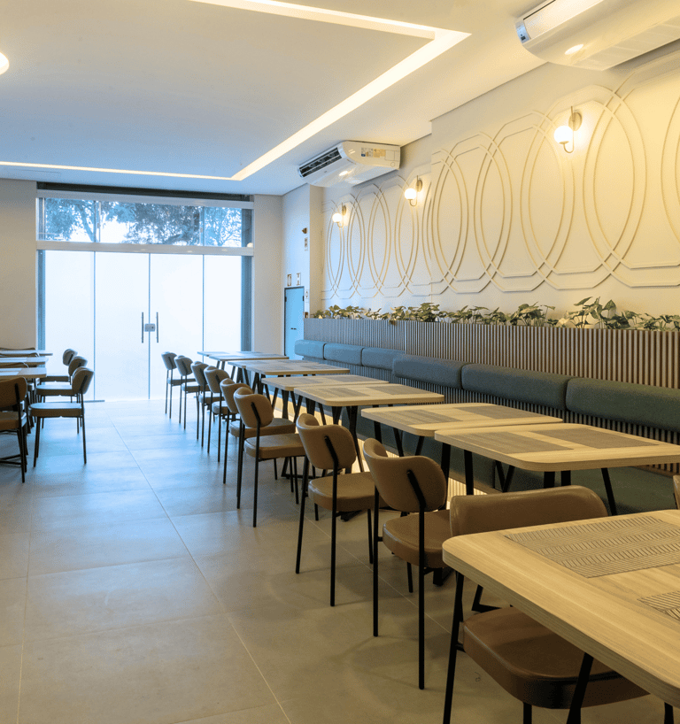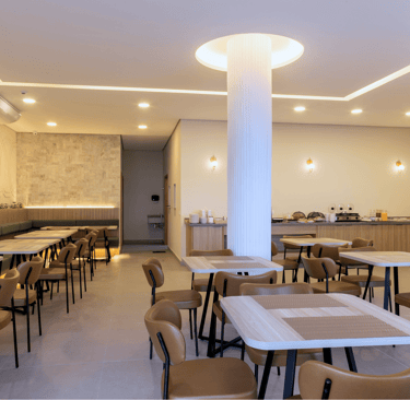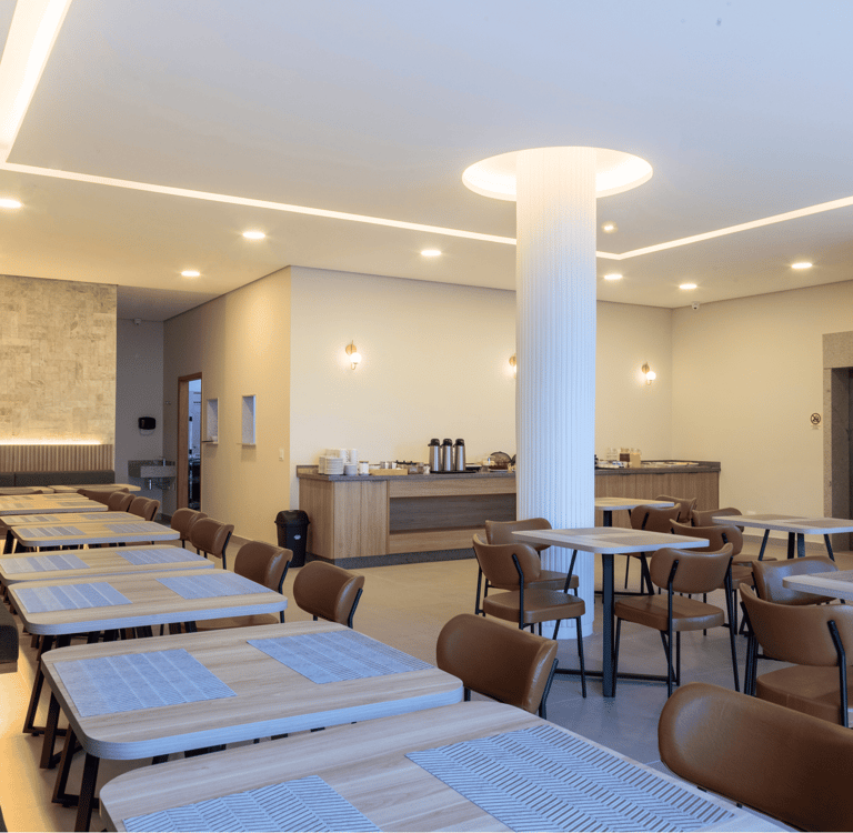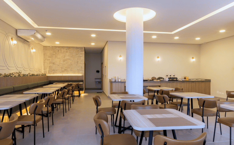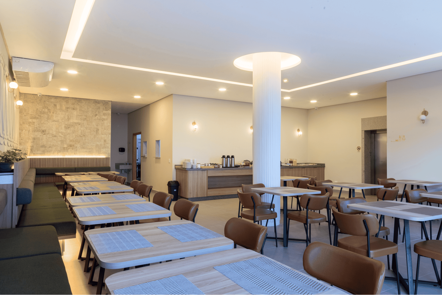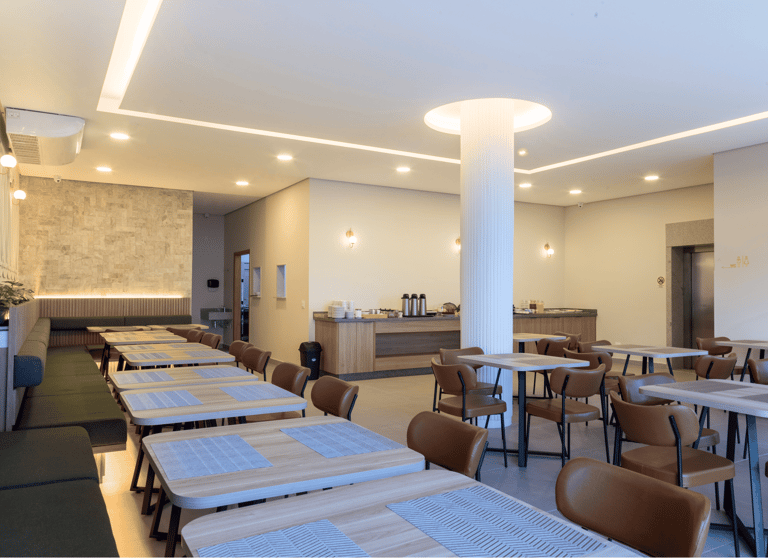 O salão é iluminado, confortável e organizado de forma a proporcionar fluidez e tranquilidade. As mesas bem distribuídas, o pilar central iluminado e o toque de vegetação ao longo das paredes criam um clima convidativo, perfeito para começar o dia apreciando um café da manhã preparado com cuidado.