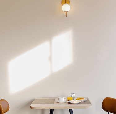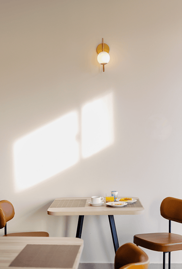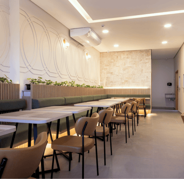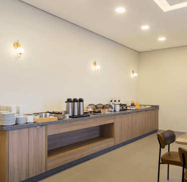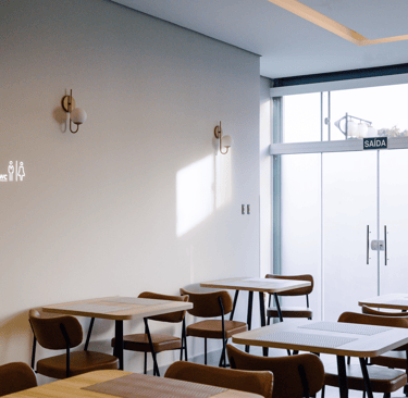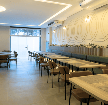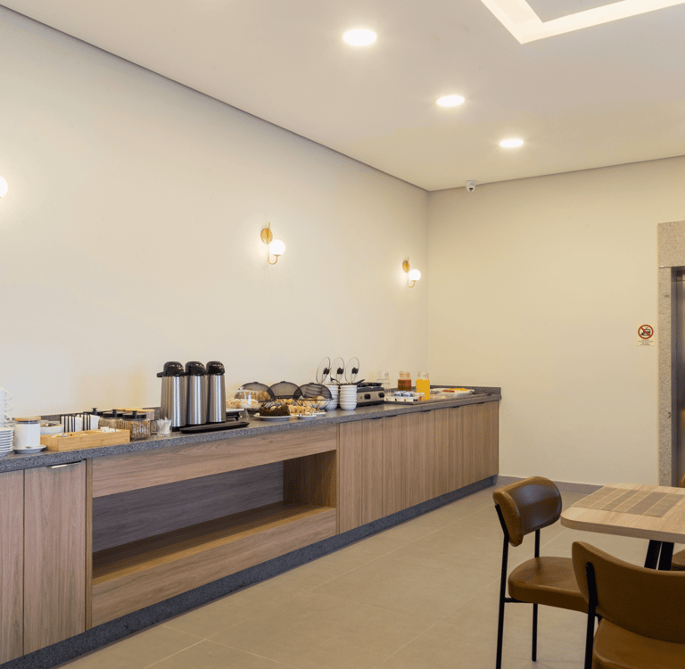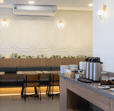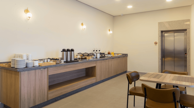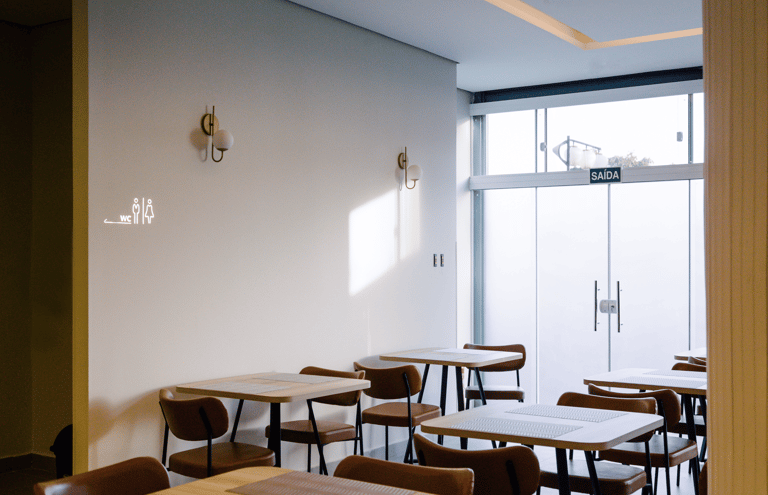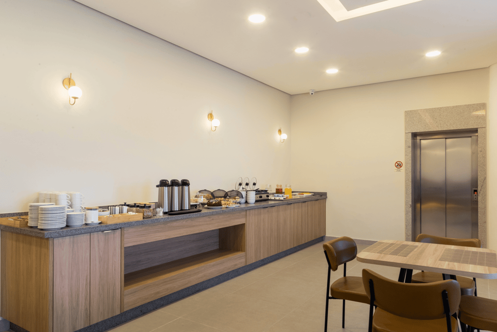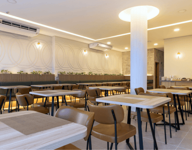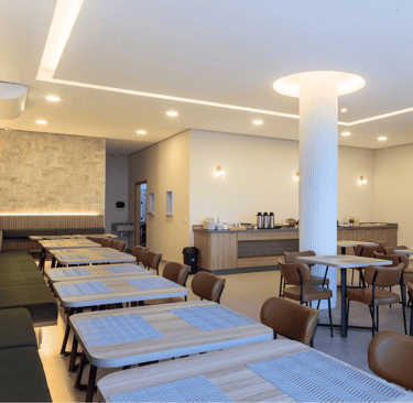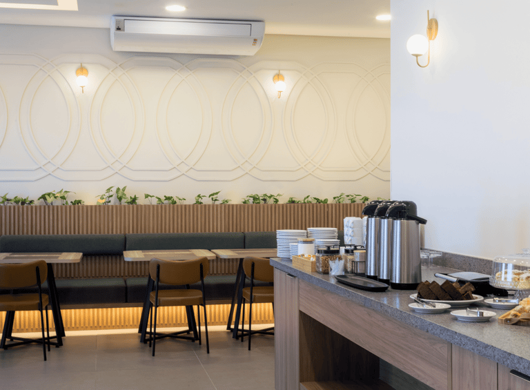 O salão é iluminado, confortável e organizado de forma a proporcionar fluidez e tranquilidade. As mesas bem distribuídas, o pilar central iluminado e o toque de vegetação ao longo das paredes criam um clima convidativo, perfeito para começar o dia apreciando um café da manhã preparado com cuidado.