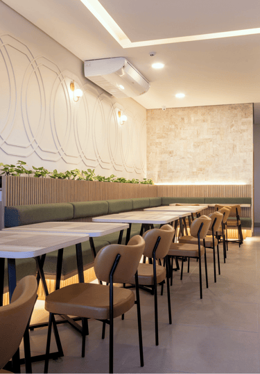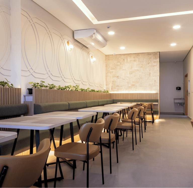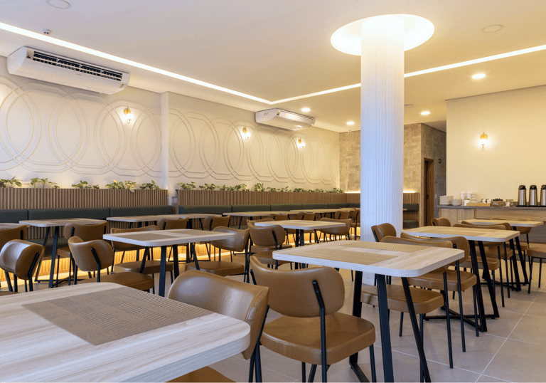 O restaurante do Hotel Varsóvia Express foi projetado para oferecer uma experiência agradável em um ambiente amplo e acolhedor. A decoração segue uma interpretação contemporânea do Art Déco, presente nos painéis geométricos, nas linhas suaves e na combinação equilibrada entre madeira, iluminação indireta e tons neutros.